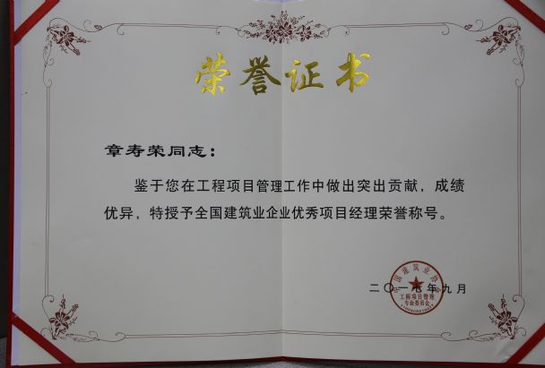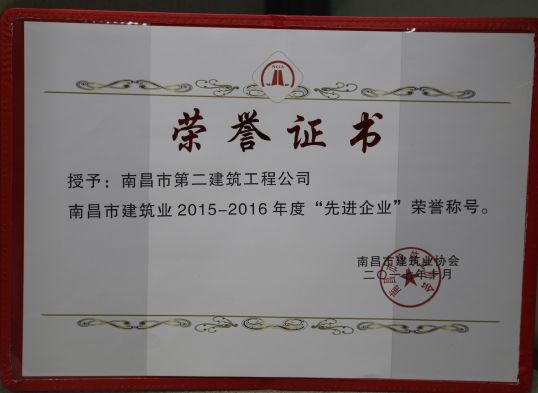 南昌市建筑業(yè)協(xié)會(huì)對(duì)公司頒發(fā)了南昌市建筑業(yè)2015-2016年度“先進(jìn)企業(yè)”榮譽(yù)稱號(hào),對(duì)公司建造師章壽榮、何靜、胡建平、高波頒發(fā)了南昌市建筑業(yè)2015-2016年度“優(yōu)秀建造師”榮譽(yù)稱號(hào);中國(guó)建筑業(yè)協(xié)會(huì)對(duì)章壽榮頒發(fā)了全國(guó)建筑業(yè)企業(yè)優(yōu)秀項(xiàng)目經(jīng)理榮譽(yù)稱號(hào)。